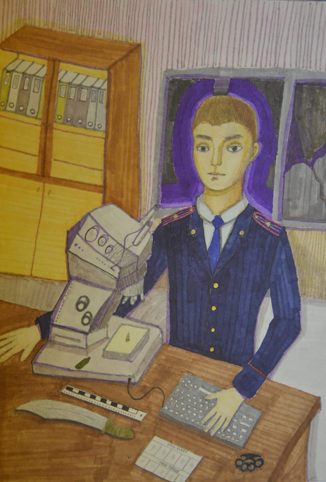 Одиннадцатилетняя Полина Дрокина из Первоуральска изобразила папу — начальника экспертно-криминалистического отделения, который при помощи микроскопа исследует изъятое у преступников холодное оружие и боеприпасы.
