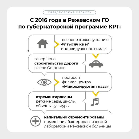 За время действия программы, запущенной по инициативе Евгения Куйвашева, в Режевском городском округе построены многоквартирные жилые дома для переселения граждан и введено в эксплуатацию 47 тысяч квадратных метров индивидуального жилья. Завершено строительство дороги в селе Останино, капитально отремонтированы помещения бактериологической лаборатории Режевской больницы, построен филиал центра «Микрохирургия глаза», отремонтированы детские сады, школы, объекты культуры.