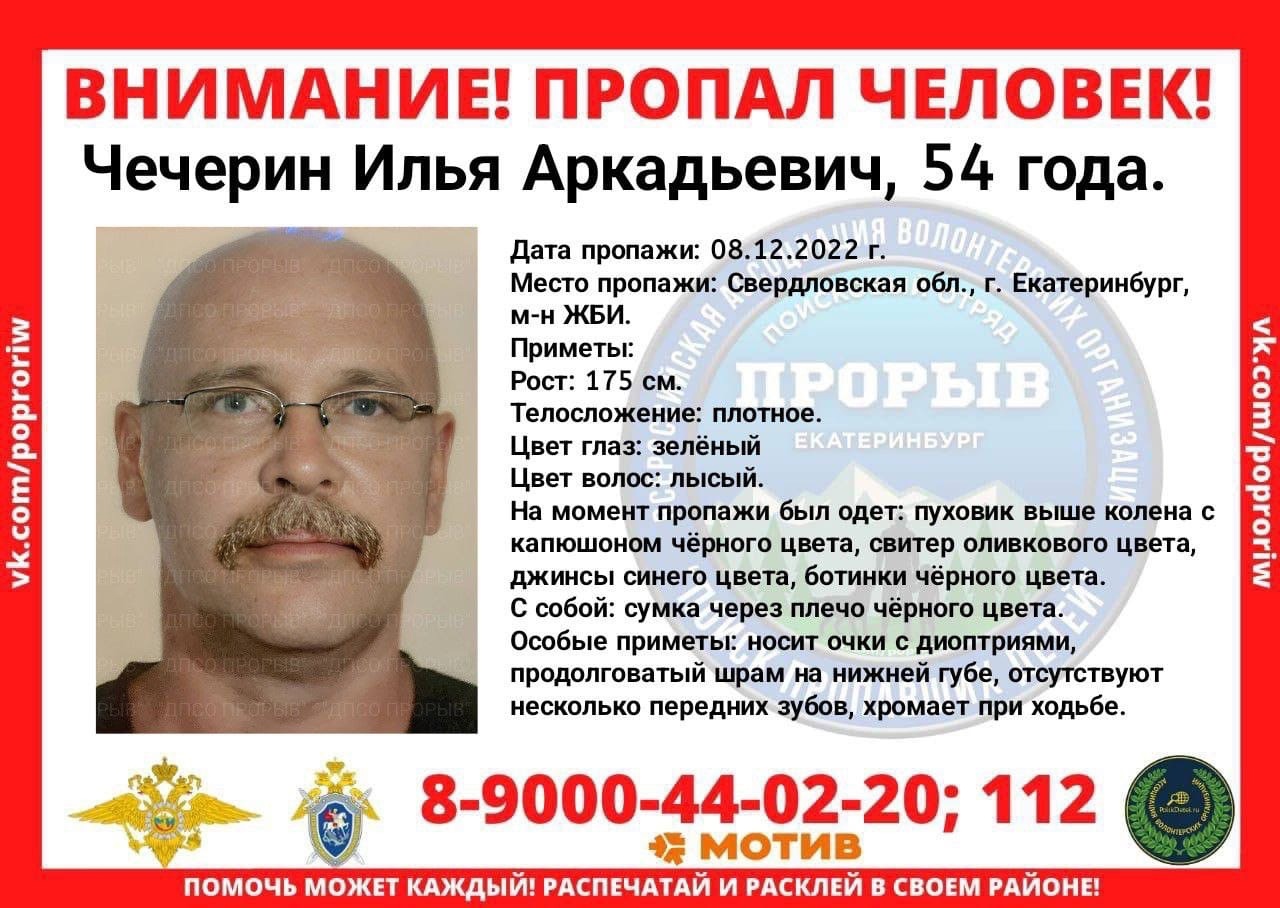 В Екатеринбурге с 8 декабря ищут 54-летнего Илью Чечерина. Он ушел на прогулку в Шарташский лесопарк и пропал.