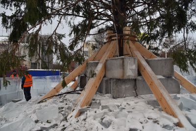 Основным украшением, конечно же, стала 28-метровая ель, которую привезли из заповедника. Сейчас ведутся работы по обустройству ее основания.
