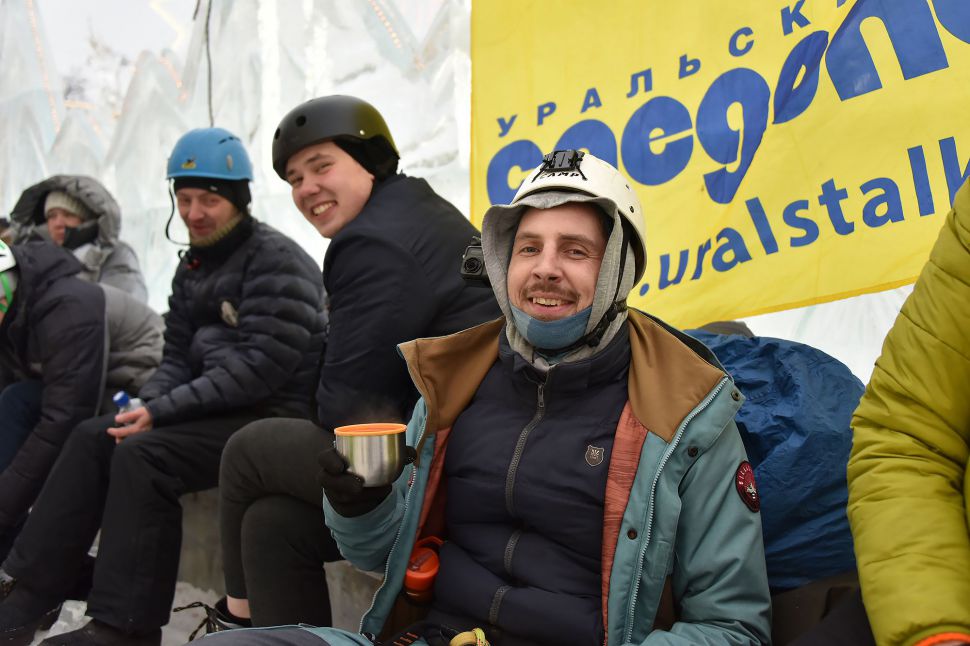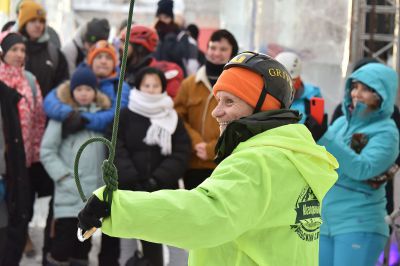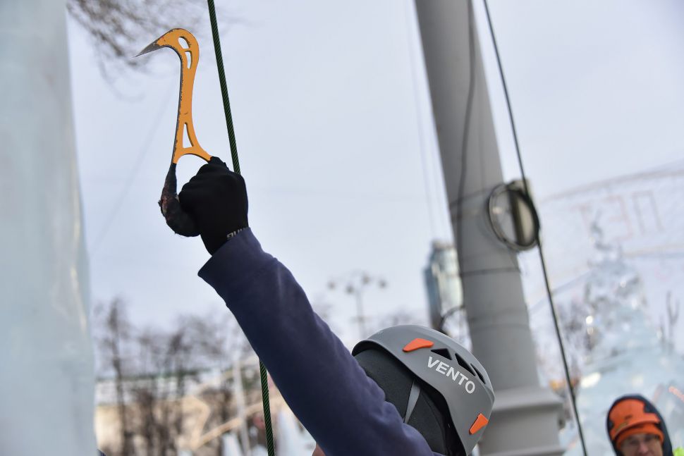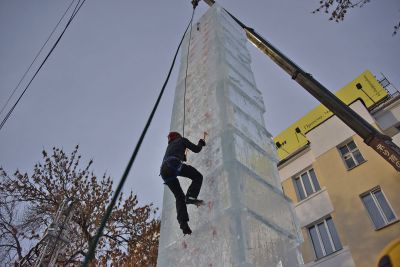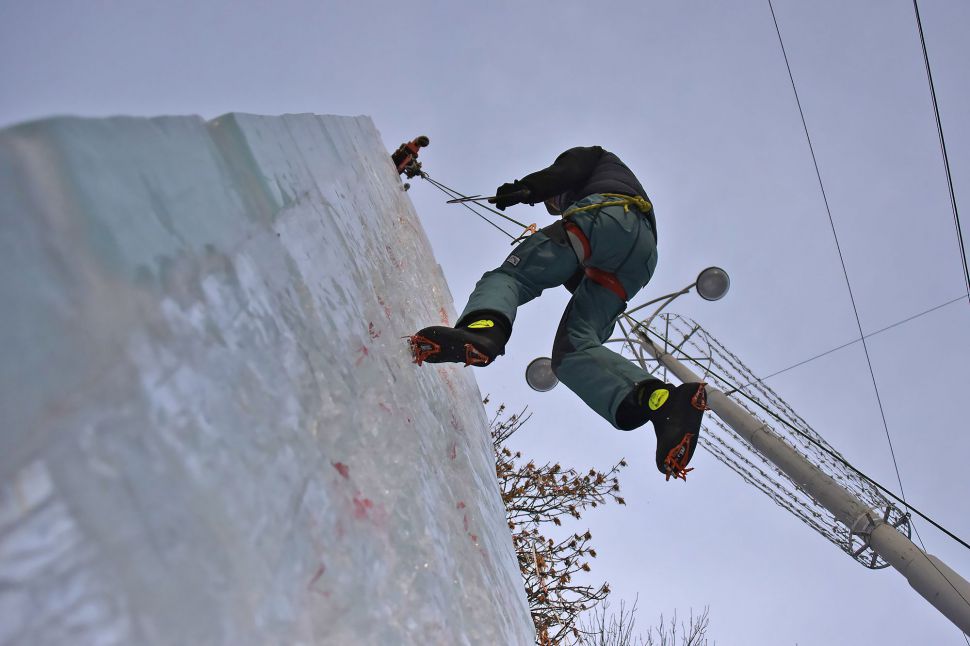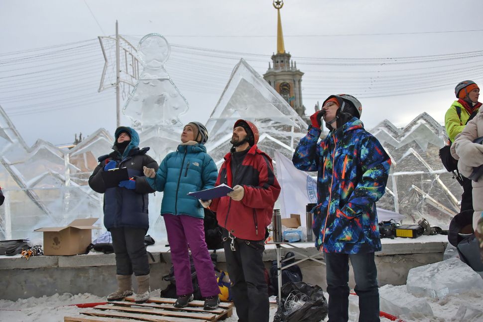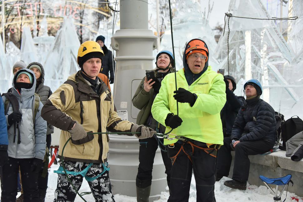 Участники соревнований на скорость взбирались на ледовую колонну высотой около 14 метров. Самые маленькие ледолазы пробовали свои силы на стене, ограждающей главную новогоднюю елку Екатеринбурга.