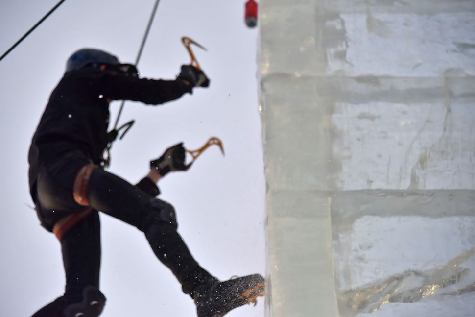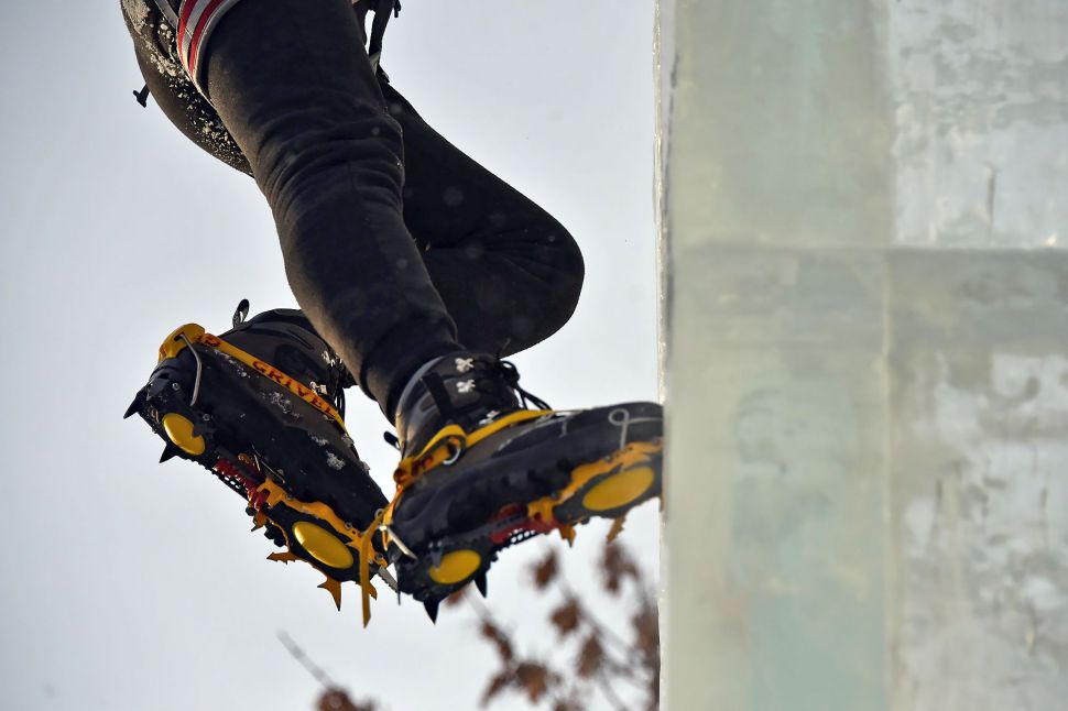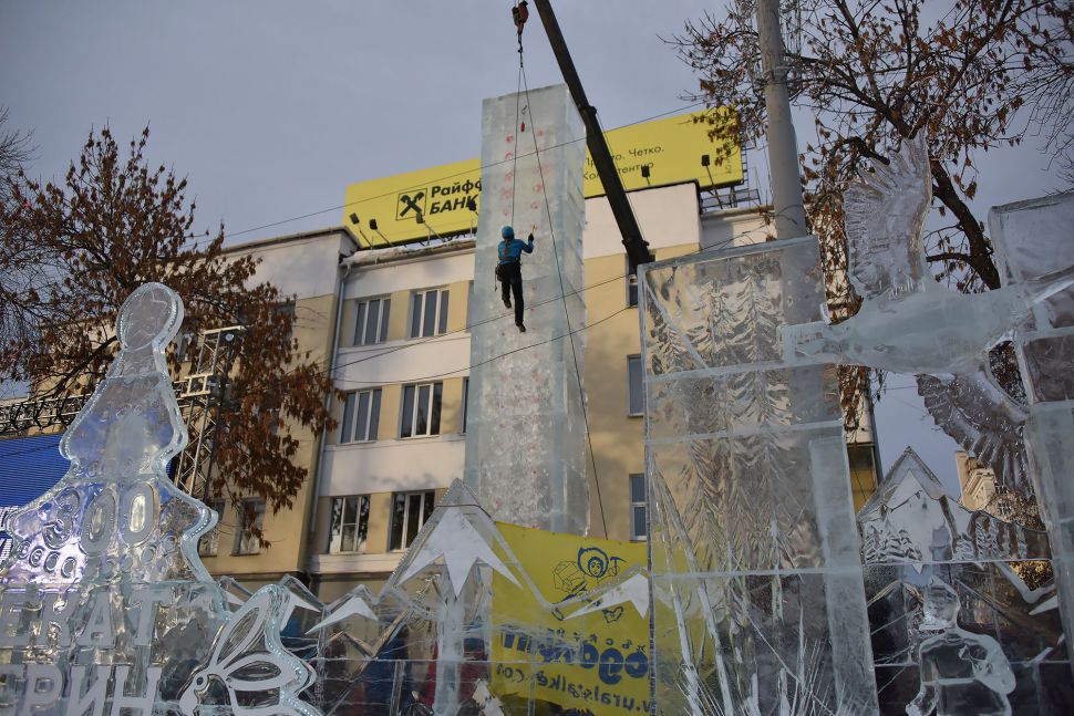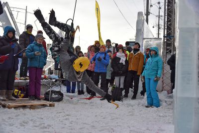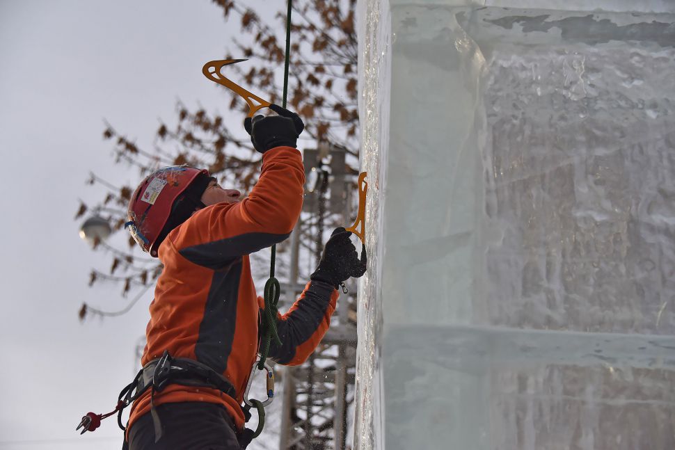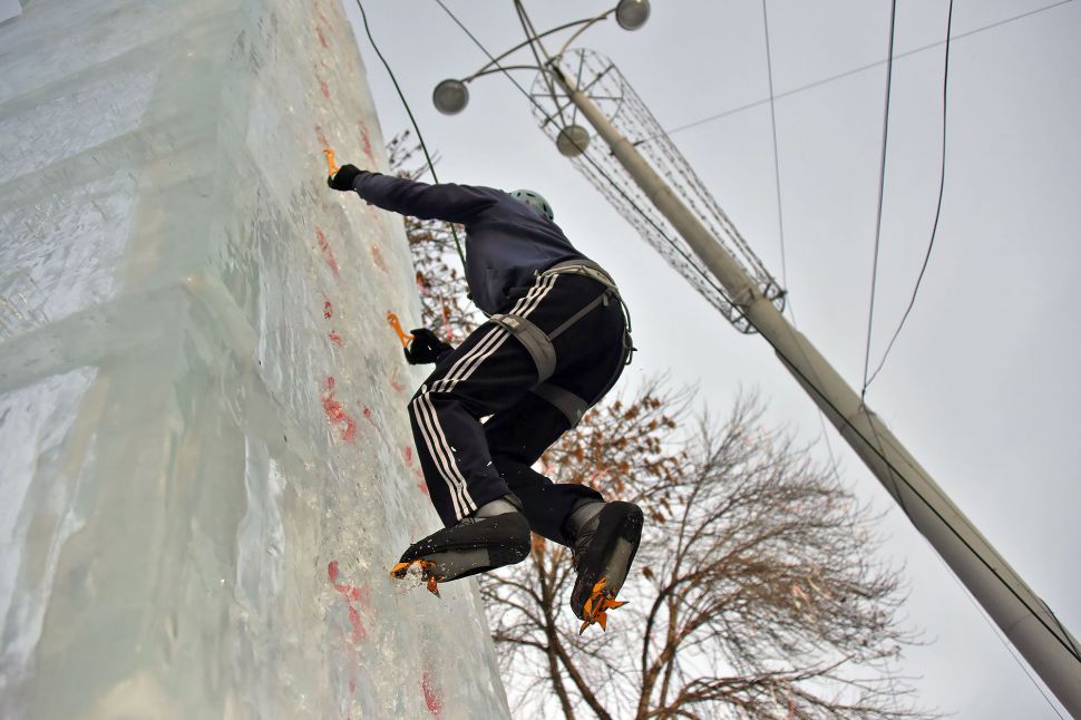 Участники соревнований на скорость взбирались на ледовую колонну высотой около 14 метров. Самые маленькие ледолазы пробовали свои силы на стене, ограждающей главную новогоднюю елку Екатеринбурга.