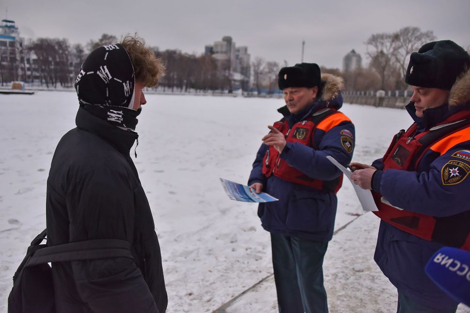 В центре Екатеринбурга спасатели ловили любителей сократить путь по замерзшему городскому пруду. Они раздавали памятки, напоминали о правилах безопасности и штрафе до 5 тысяч рублей.