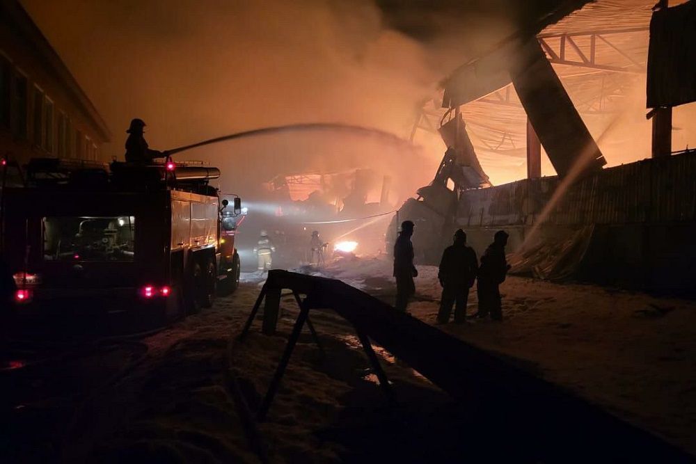 Сигнал о пожаре на пульт диспетчера поступил сегодня в 02:39. Тушение осложнялось большой горючей загрузкой ангара, сообщили в пресс-службе регионального МЧС.