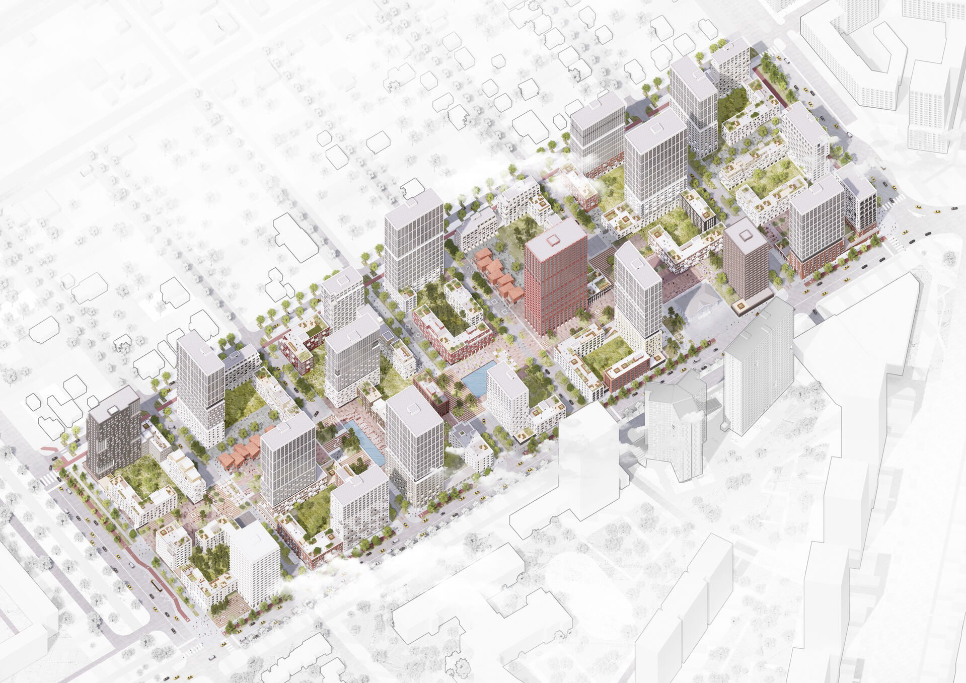 «Новые кварталы сохраняют частую сетку городских улиц. В результате получается комфортное городское пространство с настоящей квартальной планировкой. Семь кварталов поделены на 17 жилых групп, объединенных пешеходным бульваром, проходящим по центру кварталов. На бульвар выходят преимущественно 5-этажные дома и детские сады», — отметили специалисты.