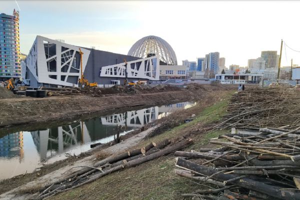В Екатеринбурге на набережной реки Исеть рядом со строящейся ледовой ареной УГМК снесли все деревья. Распиленные стволы и ветки ровными штабелями уложили возле парка «Россия — моя история» и на противоположном берегу.