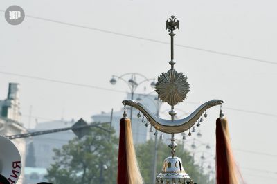 Торжественное шествие открыли военнослужащие роты почетного караула Центрального военного округа. Под звуки военного марша «Священная война» они внесли государственный флаг России и копию Знамени Победы.