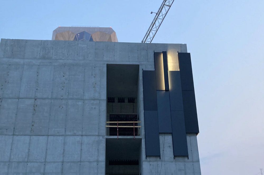 В Екатеринбурге рабочие, которые занимаются строительством Музея оружия, начали обшивать фасад здания. Первые черные панели со встроенным освещением разместили на стене со стороны улицы Гоголя.