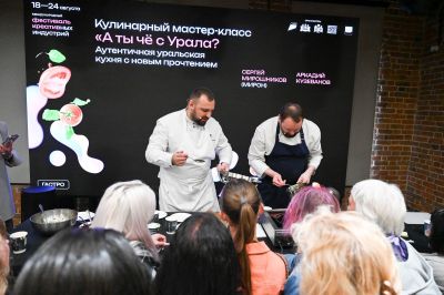 Два шеф-повара в креативном кластере «Домна» показали многочисленной публике как приготовить оригинальные блюда с уральским вкусом. Свердловские кулинары провели мастер-класс «А ты чё с Урала? Аутентичная уральская кухня с новым прочтением». Во время него ребята рассказали, что работают над созданием кулинарной книги с уральскими рецептами и поделились своими взглядами на создания оригинальных вкусов, используя местные продукты.