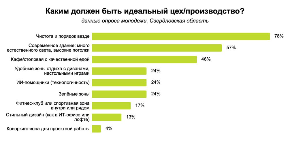 Также отмечается, что несмотря на неоднозначные показатели, половина молодых соискателей в регионе готовы строить карьеру на современном производстве. Например, на высокотехнологичном заводе. Характеристики «идеального цеха» в представлении начинающих специалистов: