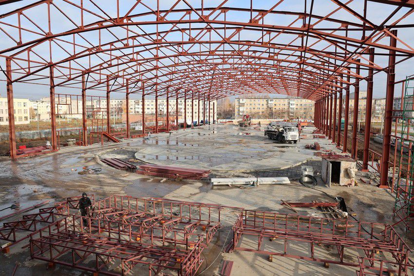 На площадке манежа заканчивается возведение металлического каркаса – осталось установить пять несущих конструкций. Параллельно продолжается укладка наружных коммунальных сетей. Легкоатлетический корпус будет иметь свою блочно-модульную котельную, ее строительство также ведется.