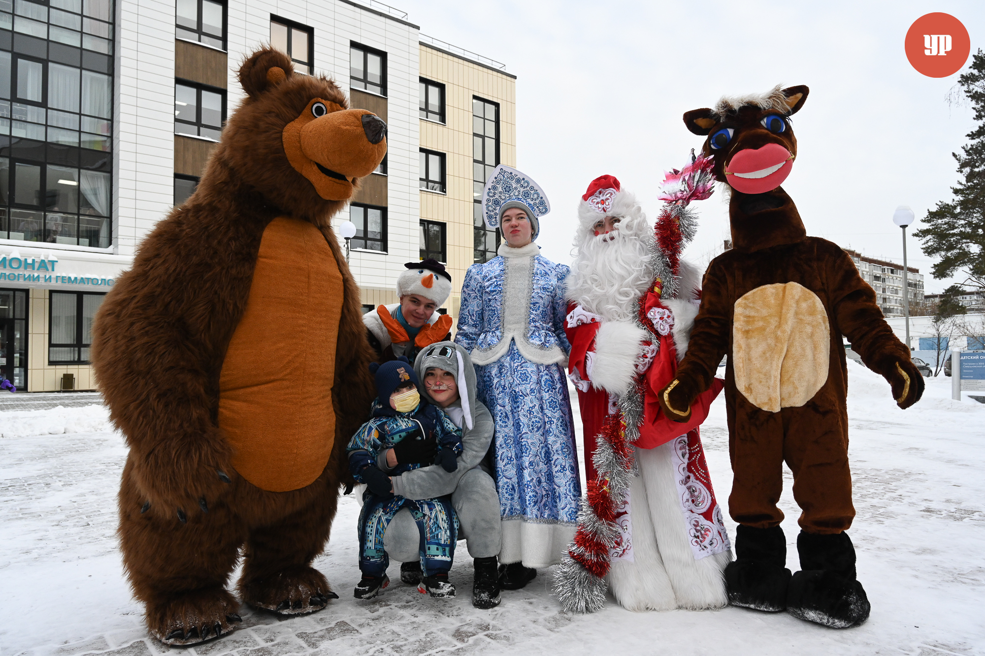 Звучит песня «Три белых коня» из доброго советского фильма «Чародеи». Снеговик с узорчатыми завитками на щеке, конь Юлий из «Трёх богатырей» затейливо отплясывают перед больничным корпусом. Рядом – Дед Мороз, Снегурочка и добродушный медведь. Волонтеры вручают подарки мамам и детям.